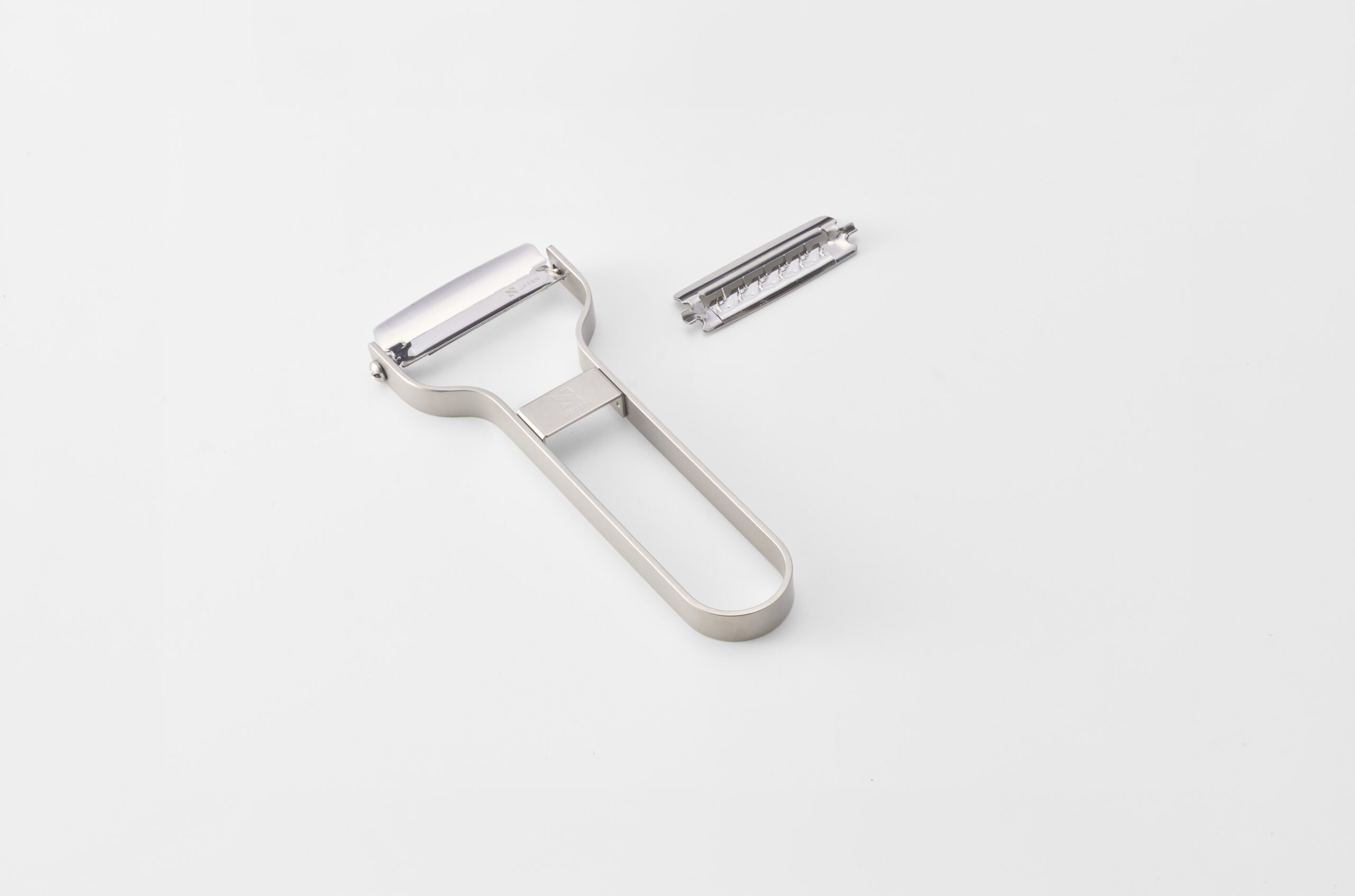 少ない力でよく切れる千切りピーラー。ハイグレードな鋼材を採用し、前後2列に配置した縦刃により段階的に食材をカットします。刃は交換可能なロングライフ設計【特許取得済】
