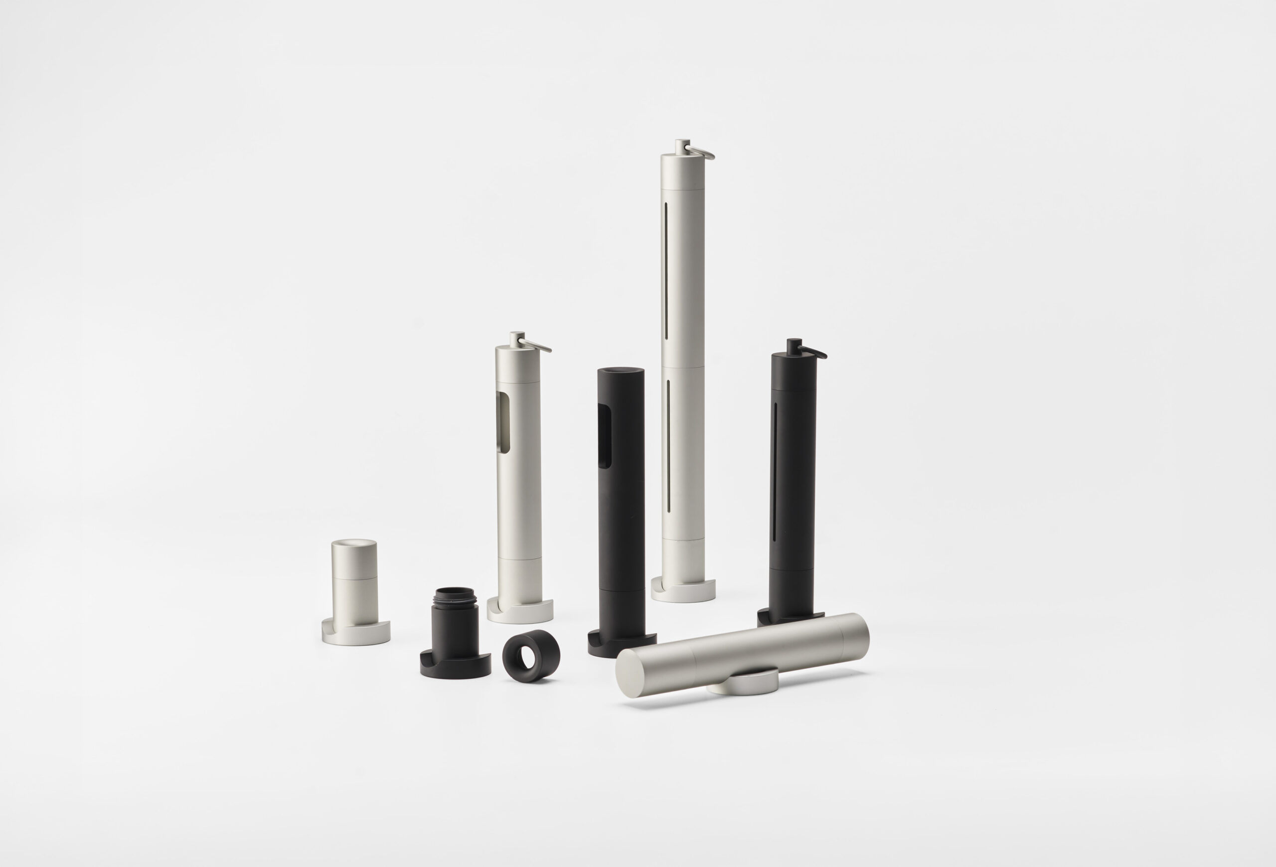 金属筒で火を覆う安全なお香たて。立てる・置く・掛けるの3WAY仕様と共通ネジ構造でパーツを組み替え、多様な長さや形状、材質のお香に対応し、お香入れとしても使える組み替え式シリーズです。