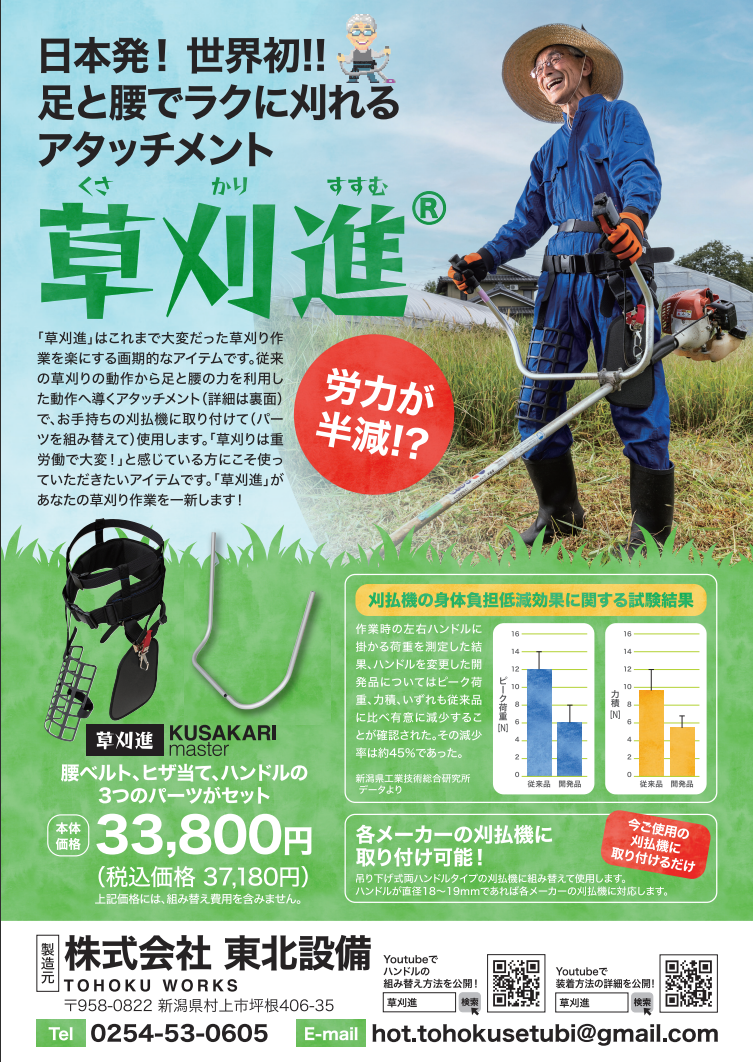 日本発世界初、労力が半減!草刈作業の常識を変える省力化革命!「省力化」、「安全性向上」、「空調服による熱中症対策」で現場の課題に応える、新潟発のソリューションです。