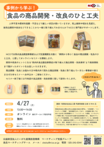 NICOでは県内食品関連事業者および支援機関を対象に「事例から学ぶ!食品の商品開発・改良のひと工夫」と題してオンラインセミナーを開催します。