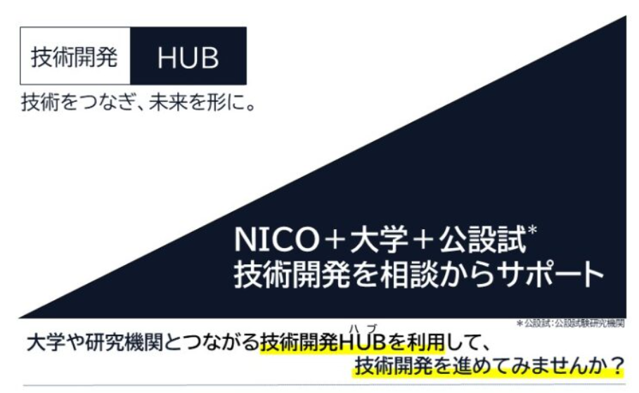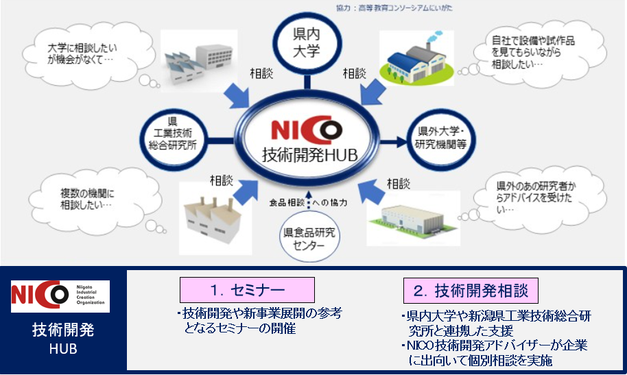 NICO(公益財団法人にいがた産業創造機構)では、大学や研究機関とのネットワークを活用し、県内企業が大学等と技術開発に係る相談を気軽に行える環境をつくり、企業の挑戦意欲や技術開発課題の解決を促進するため「技術開発HUB」を実施します。